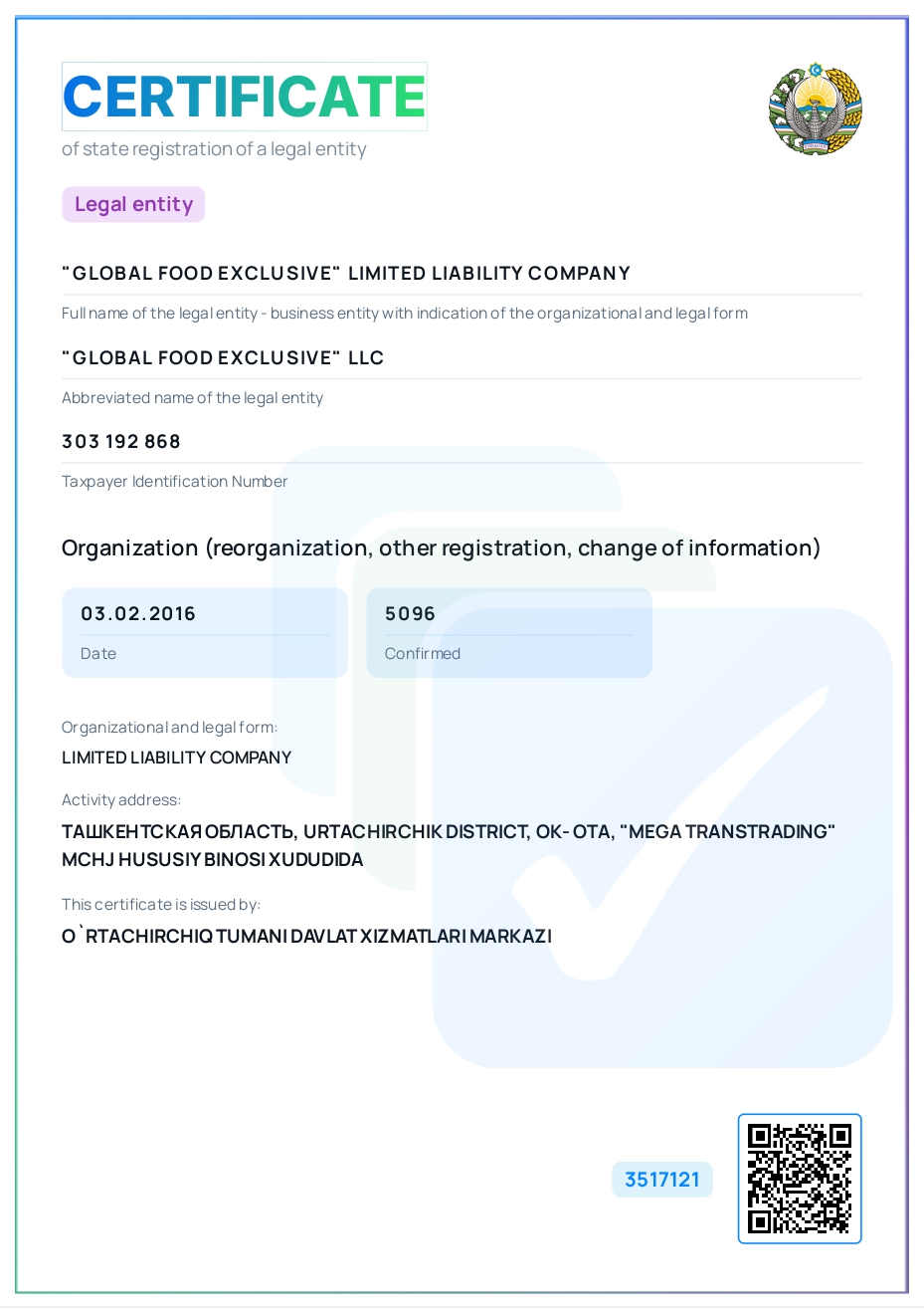 Свидетельство о государственной регистрацииСвидетельство о государственной регистрации юридического лица в Узбекистане - это официальный документ, подтверждающий факт регистрации юридического лица в государственном реестре. Он выдается регистрационной службой и является юридическим доказательством законности организации.